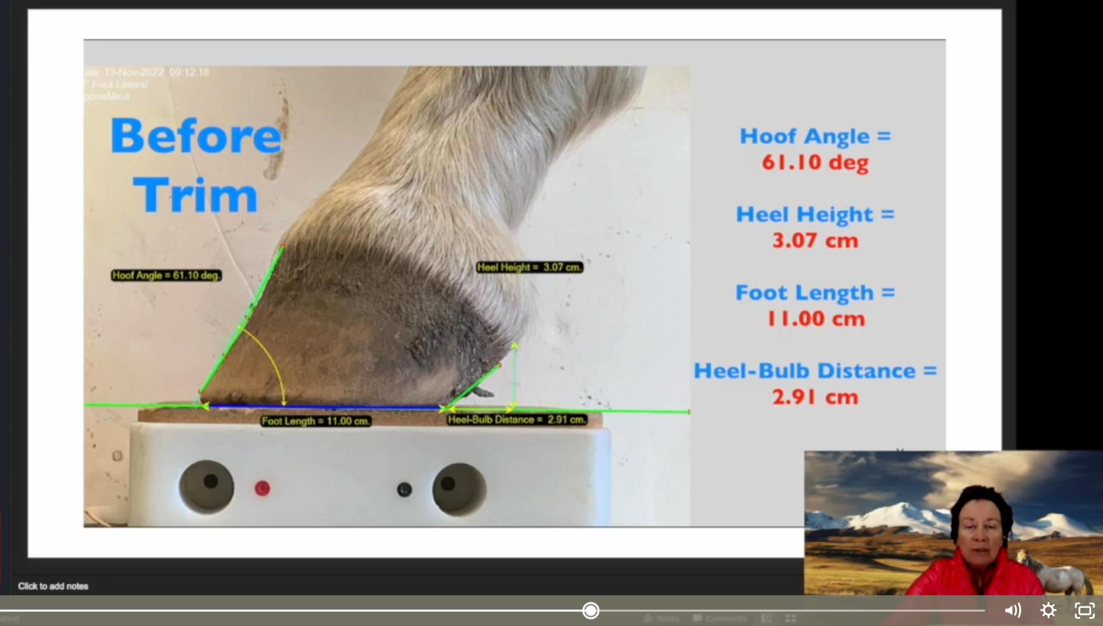 This is a quick, concise 16-minute discussion of before and after trimming images of the hoof addressing medial-lateral balance and dorso-palmar balance (palmar angle).